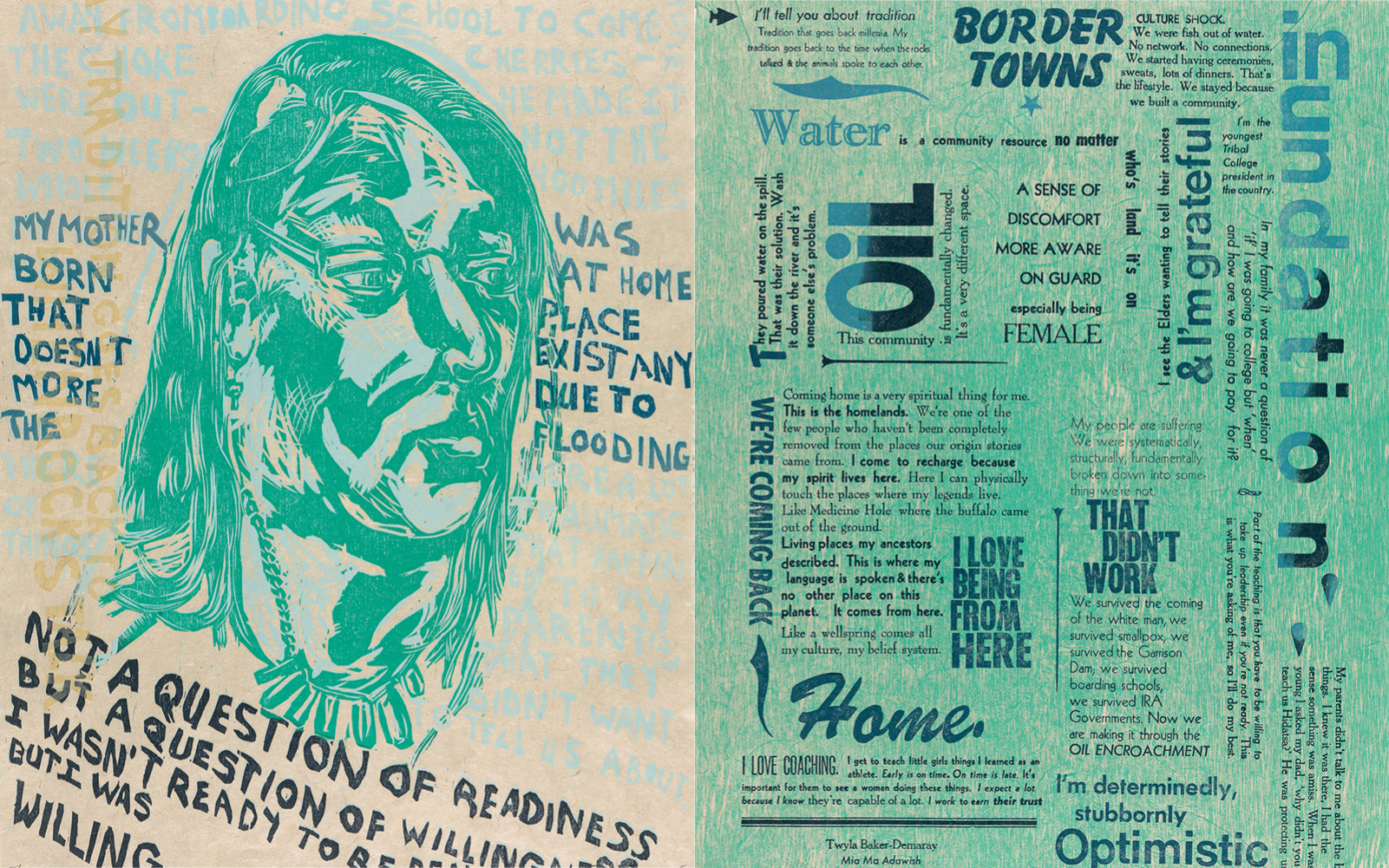 An exhibition of prints created by Daniel Heyman and NDQ’s Art Editor Lucy Ganje (titled “In Our Own Words: Native Impressions) is currently on display at the Virginia Museum of Fine Arts. The twenty-six prints on handmade paper feature portraits of Native Americans living in North Dakota. Portions of interviews with the portrait subjects are depicted on accompanying broadsides that employ graphic design methods. An interview with the two artists and additional images from the exhibition are available on the VFMA Blog: https://vmfa.museum/connect/words-native-impressions. Congratulations to Lucy! If you are interested in seeing more of her work, check out our previous post.